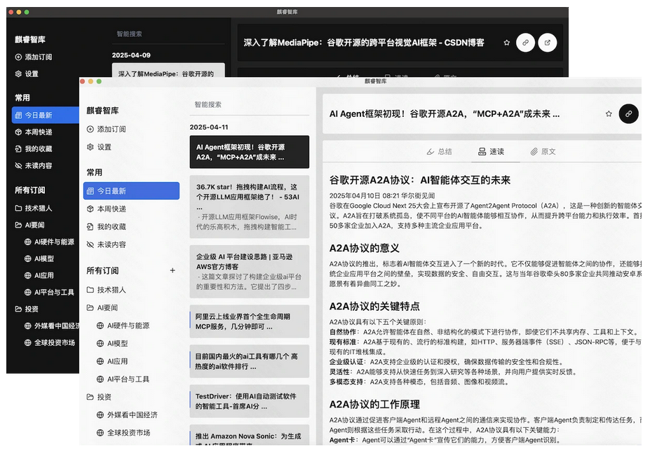 麒睿智库 完全免费和开源,这意味着所有数据都安全地存储在您自己的计算机上,不受第三方服务提供商的控制。此外,您可以根据自己的兴趣和偏好管理订阅关键词,而不会受到广告和商业化内容的打扰。