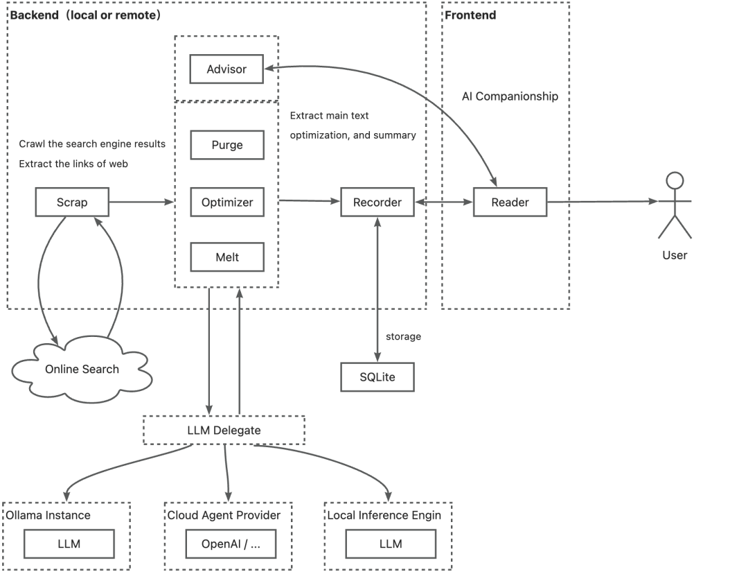 recorder: 提供本地存储功能,用户兴趣提示、原始文章和后处理优化文章保存在用户个人计算机存储中。 -
