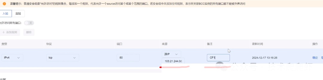 具体操作方法是,在你的云服务器厂商那里,找到安全组设置,创建一个新的安全组,命名为“Cloudflare CDN”。然后,添加入站规则,只允许TCP协议的80端口(HTTP)和443端口(HTTPS)通过。
