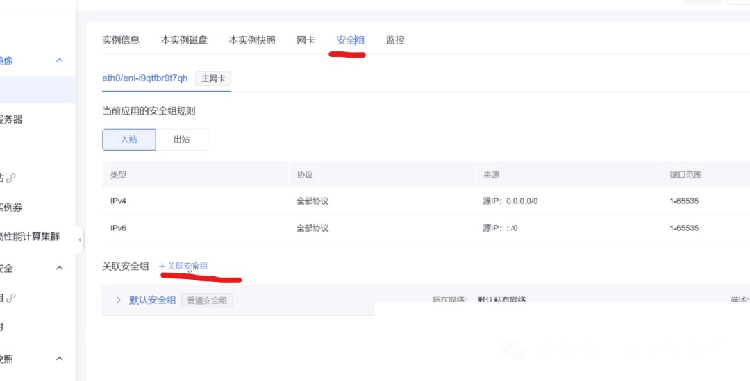现在使用的是默认安全组,我们点击这个加号关联安全组,我把Cloudflare CDN安全组选中,