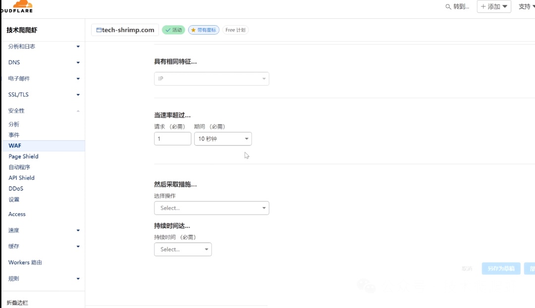 创建一个名为“IP访问限制”的规则,设置URL路径为“*”,表示保护整个网站。然后,设置具有相同特征为“IP地址”,并设置一个自定义的速率,比如“1次/10秒”。最后,将操作设置为“阻止”。这意味着,同一个IP每10秒钟只能请求一次你的网站,超出限制就会被阻止。