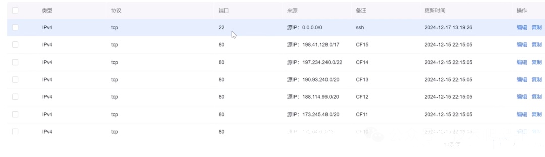 来源的话就是所有。15条Cloudflare的白名单规则,还有一条22端口的SSH规则,最后我们保存一下这个规则。