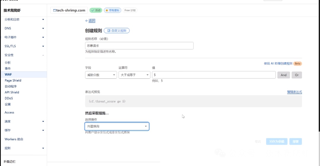 创建一个名为“恶意请求”的规则,将威胁分数设置为大于等于5。然后,将操作设置为“托管质询”。这意味着,Cloudflare会对每一个入站请求进行分析,如果发现威胁等级大于5,就会弹出一个Turnstile的5秒盾进行人机验证。