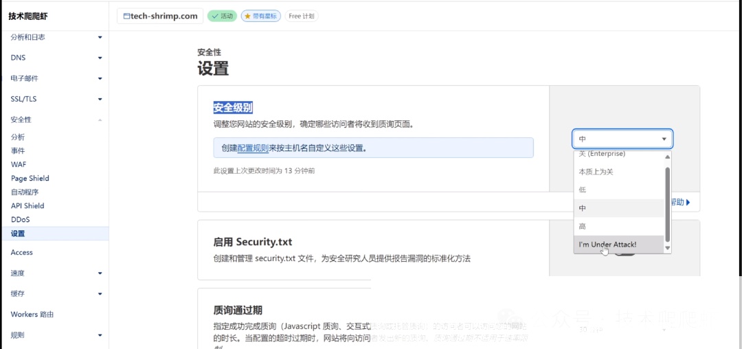 如果你的网站正在遭受DDoS攻击,Cloudflare还有一个终极杀招,那就是将安全级别设置为“I’m Under Attack”。
