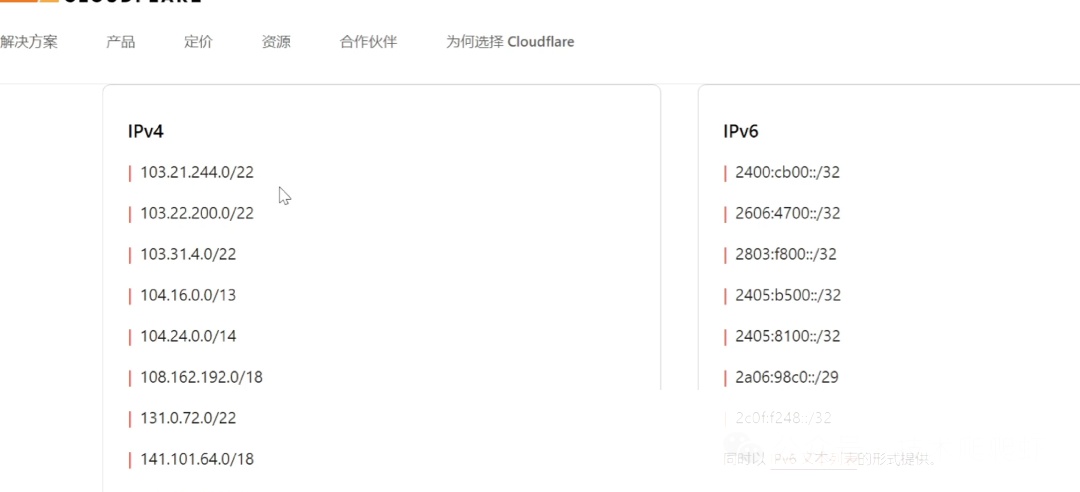 我们进入这个地址, https://www.cloudflare.com/ips/ 这里面的IP地址就是Cloudflare所有的CDN节点的IP地址。