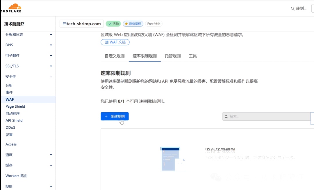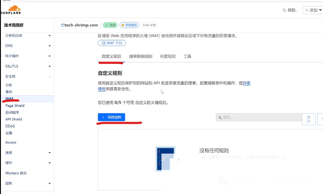 进入Cloudflare的安全性设置,找到WAF(Web Application Firewall),点击自定义规则。免费用户可以自定义5个防火墙规则,这里我介绍几个比较有用的。