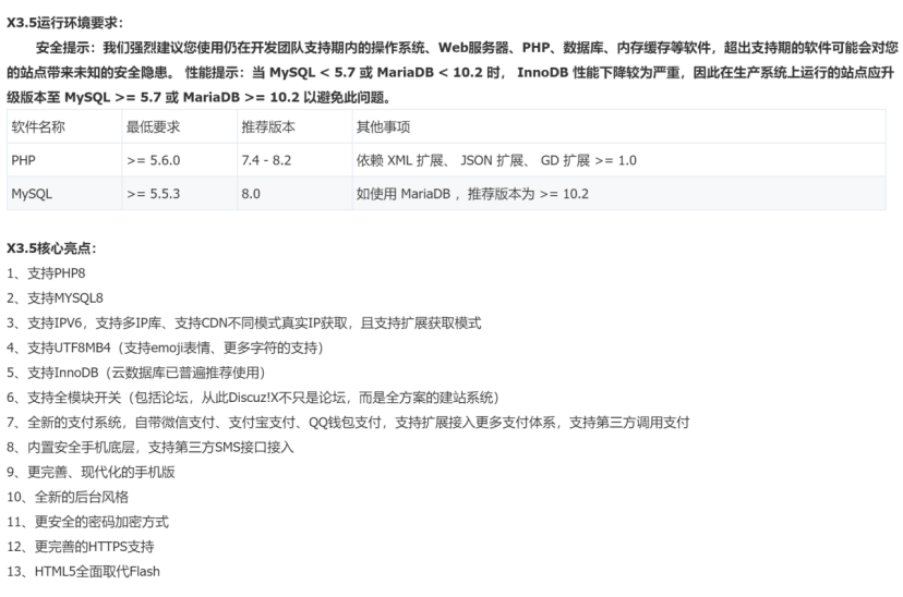 例如:最新的 Discuz!X3.5 的版本需求: