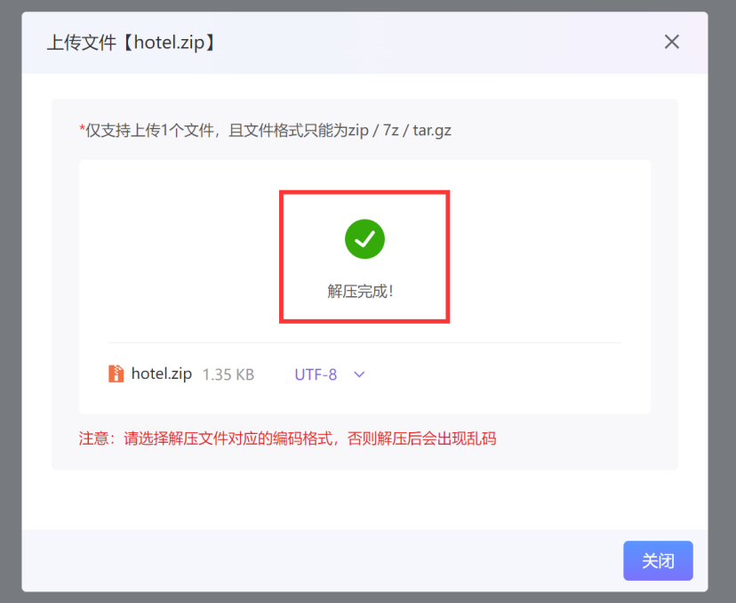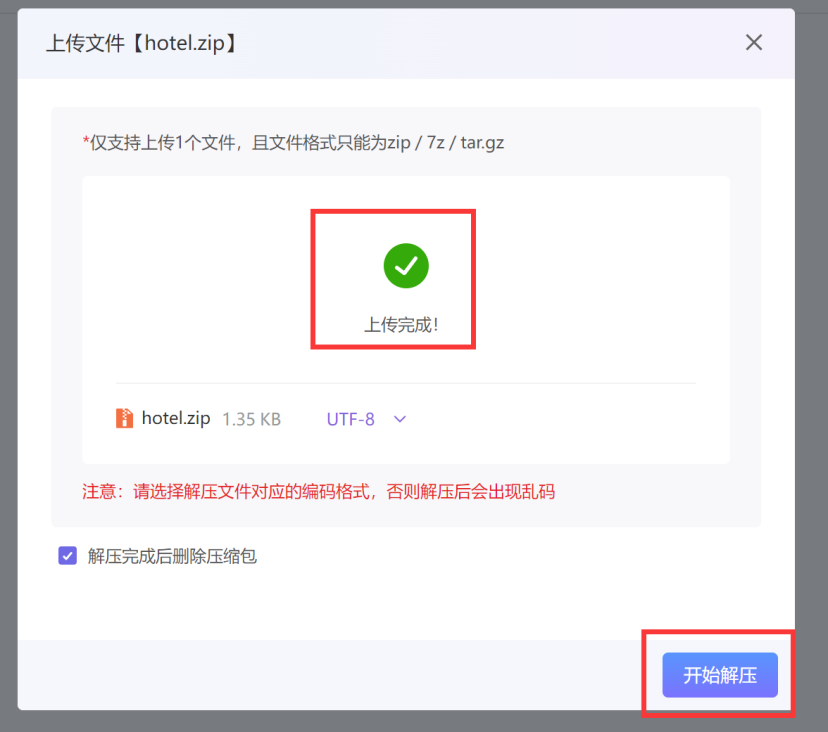 点击【开始上传】,完成后【开始解压】。