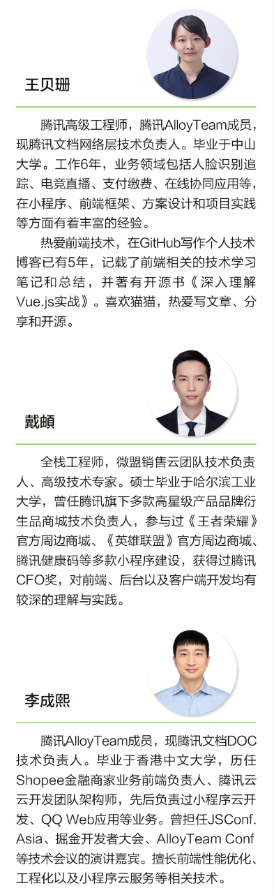 第8章结合上述原理和分析,提供了详细的避坑指南,介绍了性能问题、API兼容、小程序跳转、kbone多端构建等,还提供了登录态管理、小程序跳转和高性能WXS等开发指南。