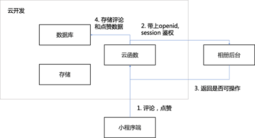 用户进行评论点赞的时候,会在小程序端发起请求调用云函数并带上openid,云函数用openid查询原有的后台服务,看看该用户是否有权限进行操作,如果有权限,则把评论和点赞的数据都写入云开发的数据库中,如图10所示。