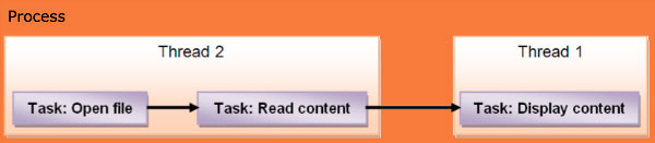 在这张图中,线程2执行了读文件的操作,而线程1执行了用户界面相关的代码。这跟你在iOS中构建你的代码很相似–主线程应该执行任何与用户界面有关的任务,然后二级线程应该执行缓慢的或者长时间的操作(例如读文件,访问网络等等)