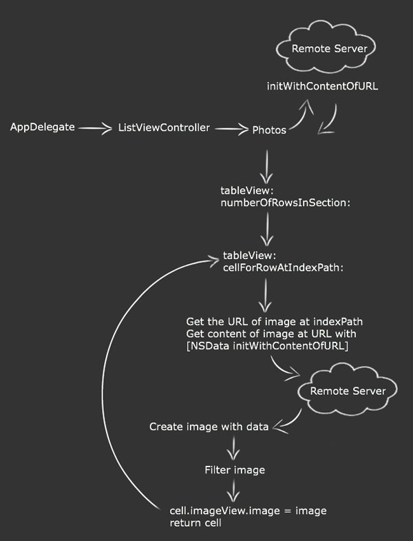 在工程的初步模型中,你有一个由字典作为其数据来源的table view。字典的关键字是图片的名字,每个关键字的值是图片所在的URL地址。本工程的目标是读取字典的内容,下载图片,应用图片滤镜操作,最后在table view中显示图片。