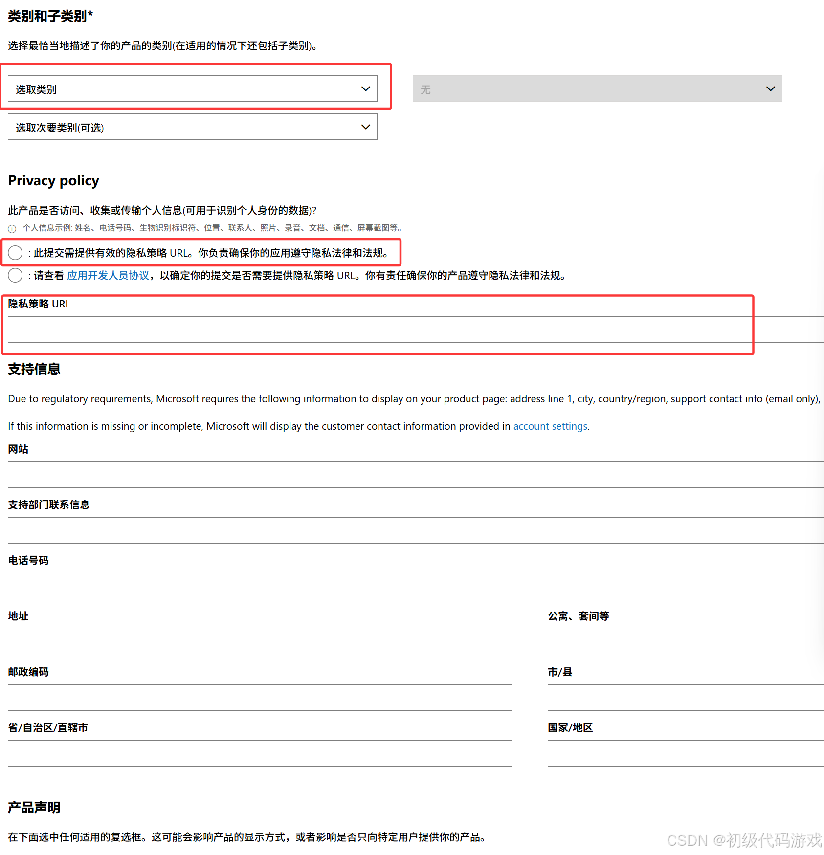 首先选择类别,然后就是这部分最困惑的部分:隐私策略(Privacy policy)。你只能选“此提交需要提供有效的隐私策略URL”,然后在隐私策略URL那里输入一个URL。