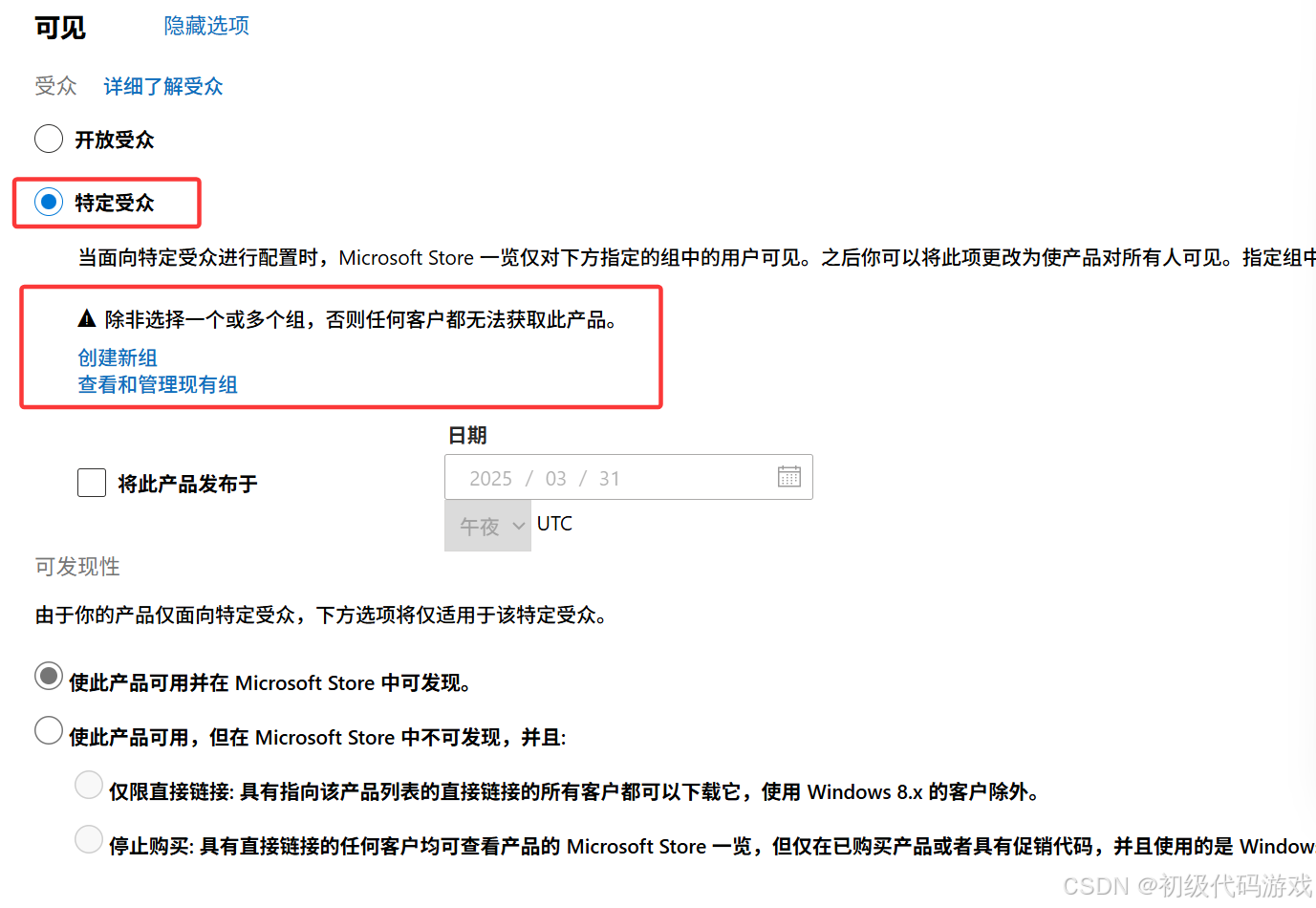 必须创建组来允许特定的受众看到。同时也可以指定此产品在商店中不可被发现,只能通过直接链接来下载。这一般是企业才用,只给自己的员工和客户使用。