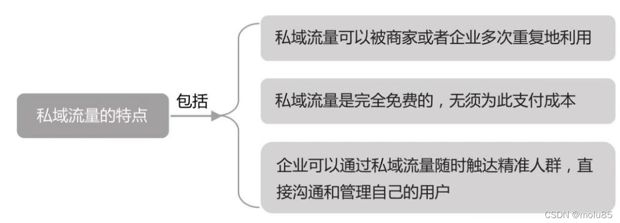 对于私域流量,目前还没有统一的具体定义,但是私域流量的确有一些优势和特点,如下图所示。
