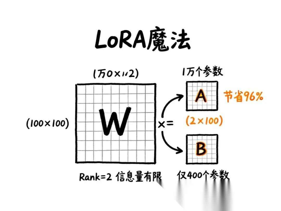 这来自线性代数的一个性质:如果一个矩阵的信息量有限(秩较低),它可以被近似分解为两个小矩阵的乘积。