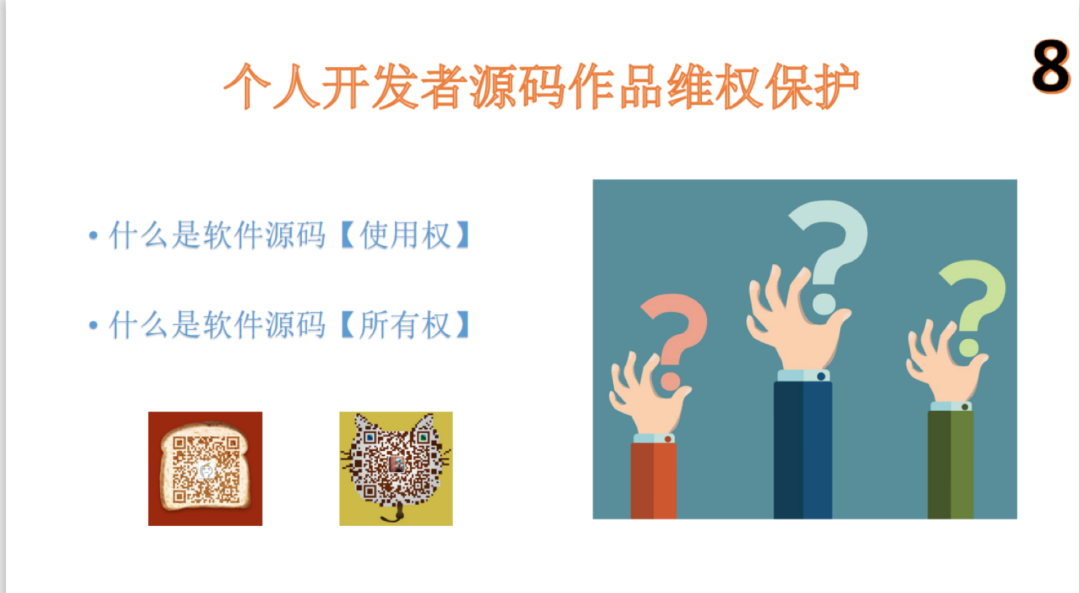 开发者源码作品维权保护。我们需要区分一下这两个权利。一个叫软件源码的使用权,一个叫软件源码的所有权。