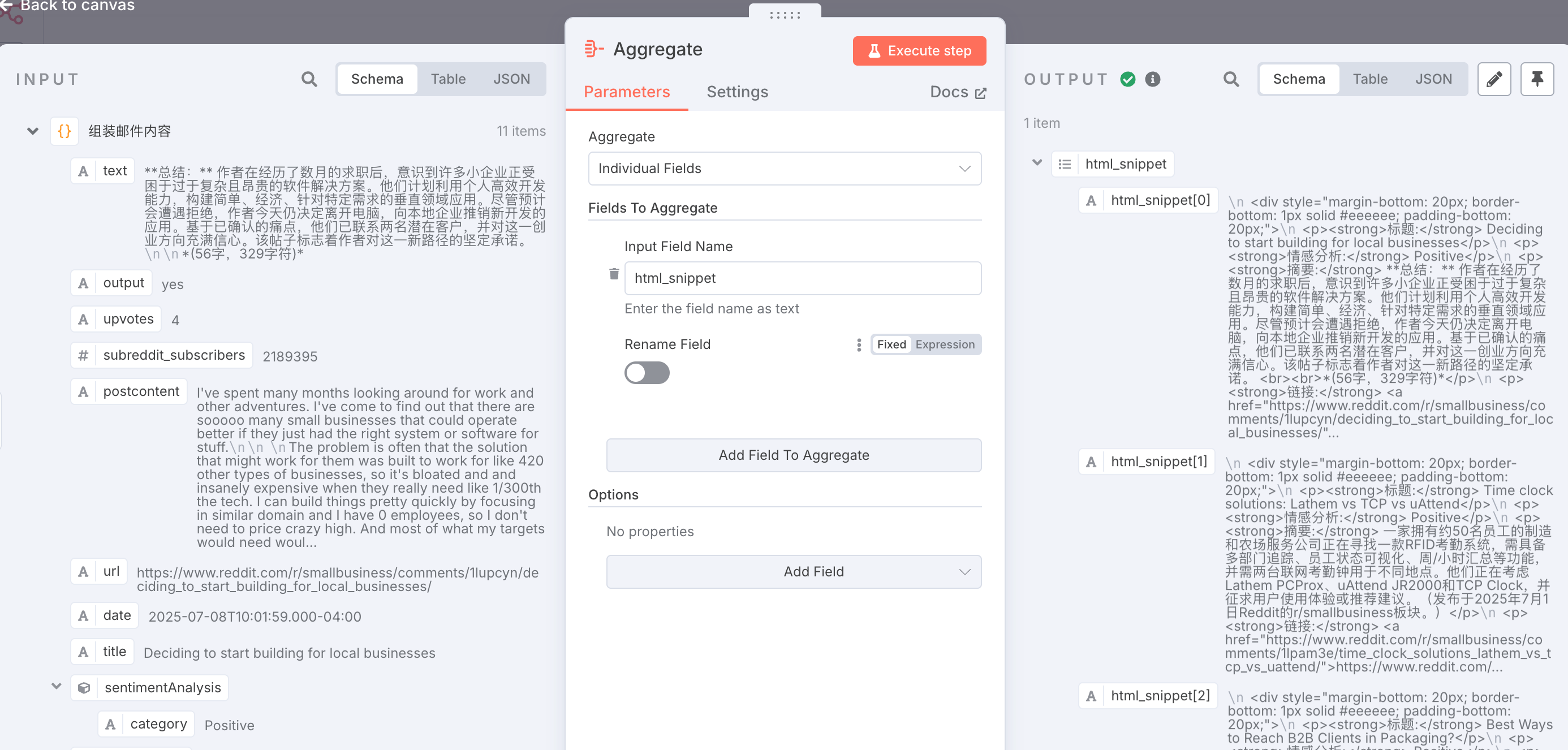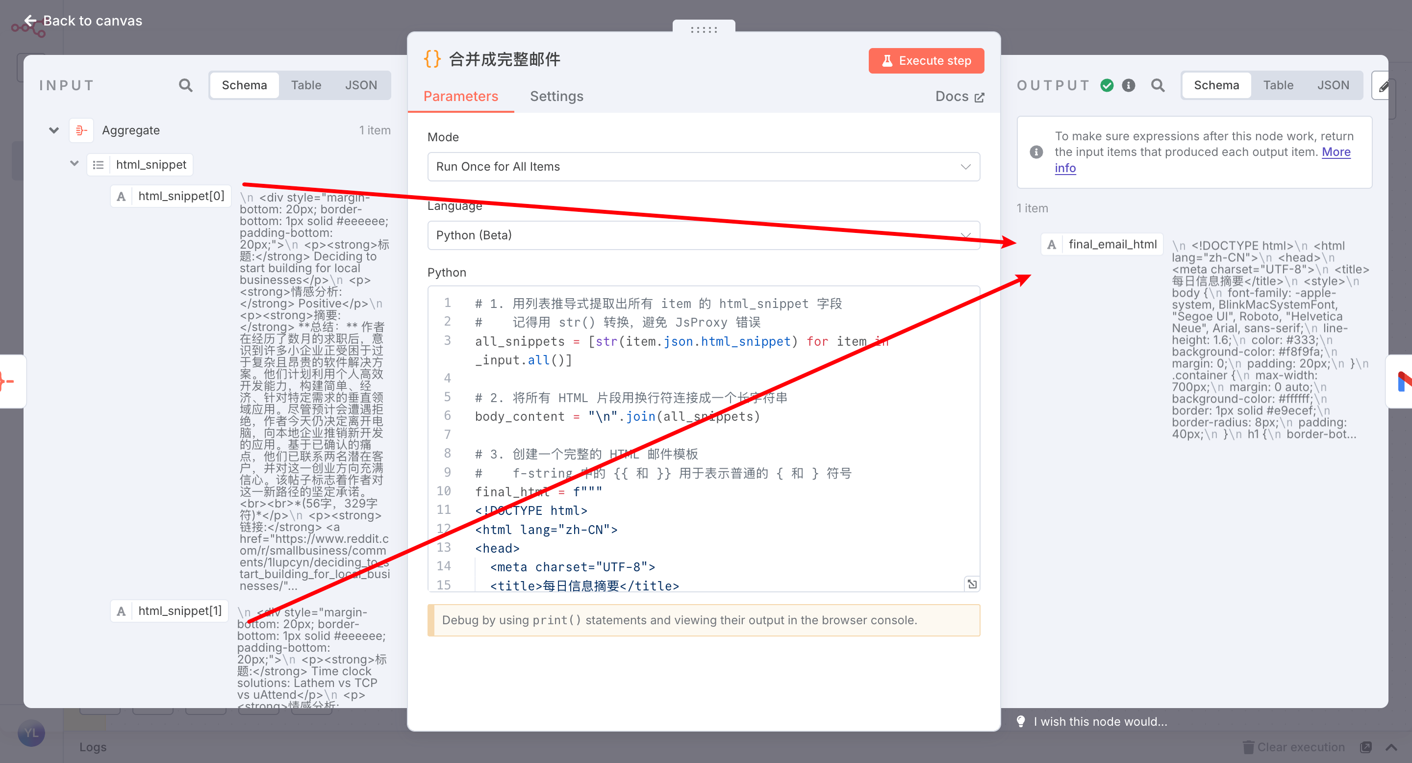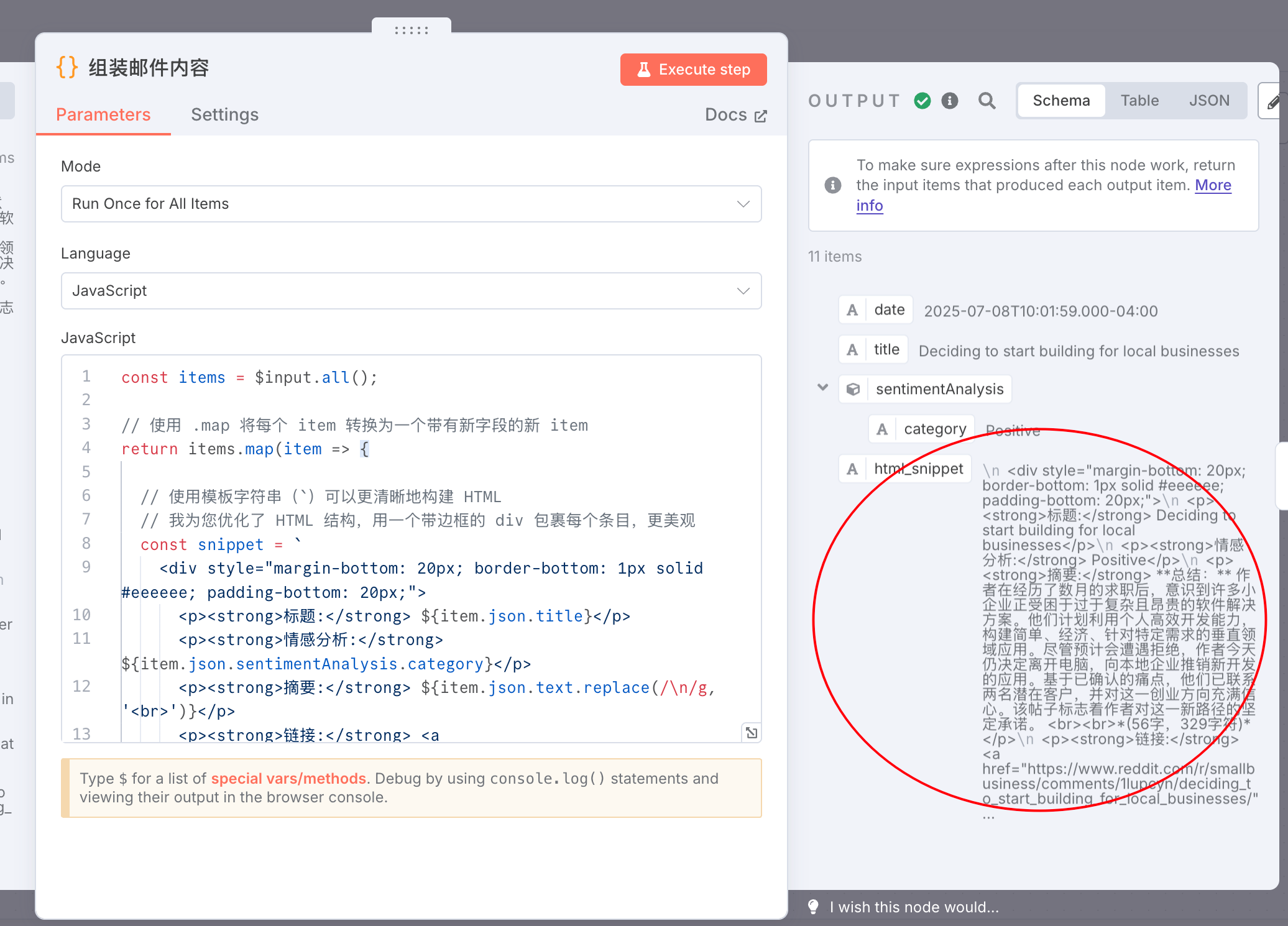 组装邮件内容 (Code): 将每个帖子的分析结果,用HTML代码片段格式化。