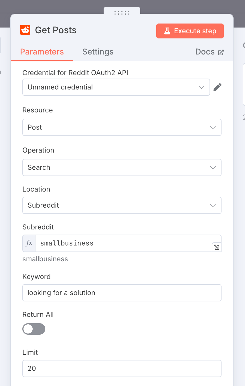 Subreddit(如smallbusiness)和Keyword(如looking for a solution),并设置Limit(如20篇)来控制获取数量。