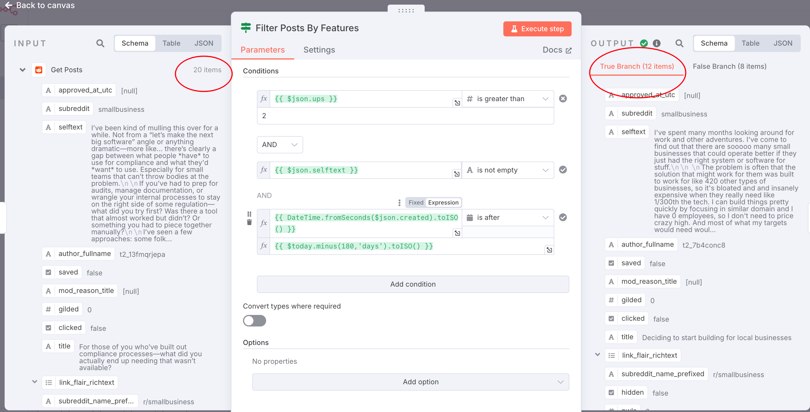 可以看到,节点从 20 个 Reddit 帖子中筛选出了 12 个符合硬性要求的信息。