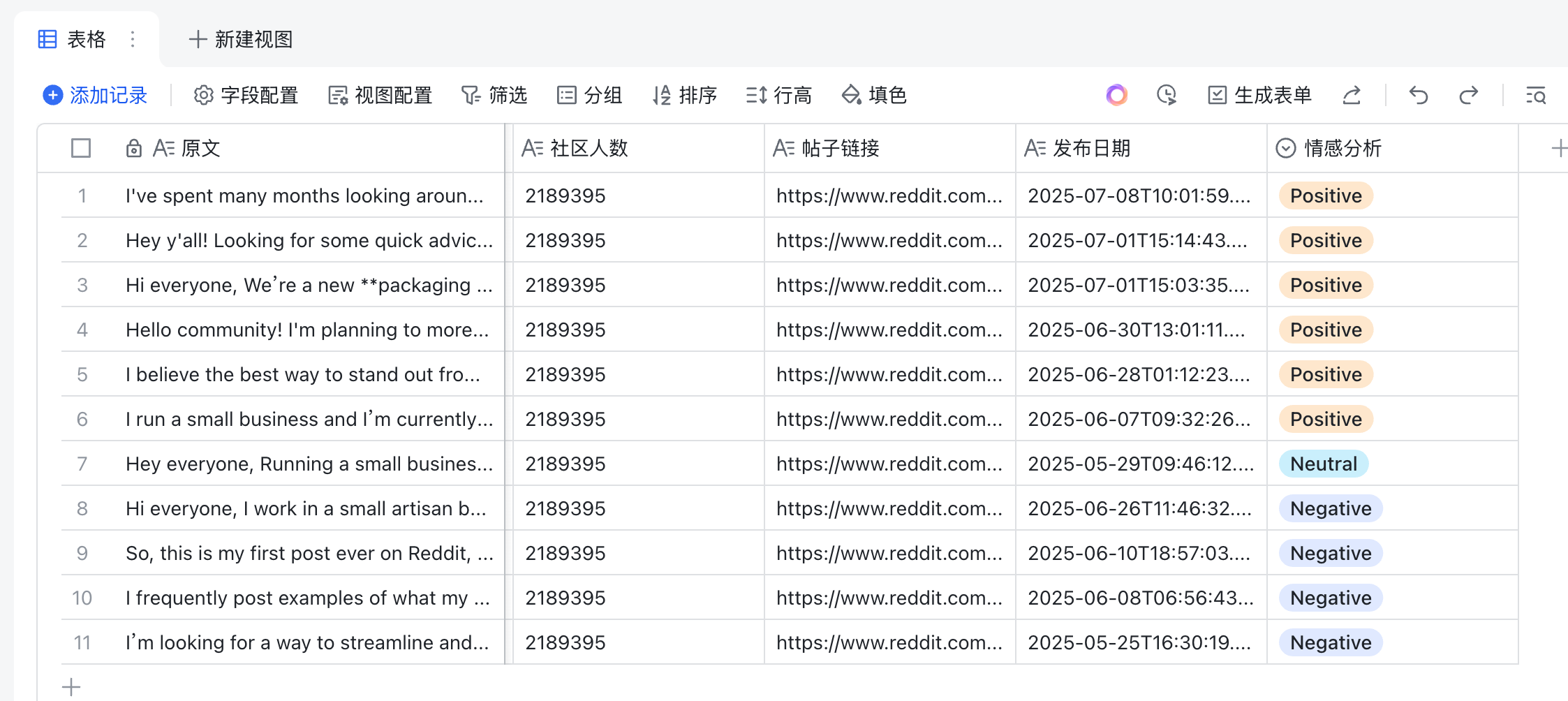- 作用:将每一篇分析过的帖子的所有信息——原文链接、摘要、商业点子、情绪、点赞数等,结构化地存入飞书多维表格。这个表格就成了我们动态更新的、永不枯竭的“商机库”。