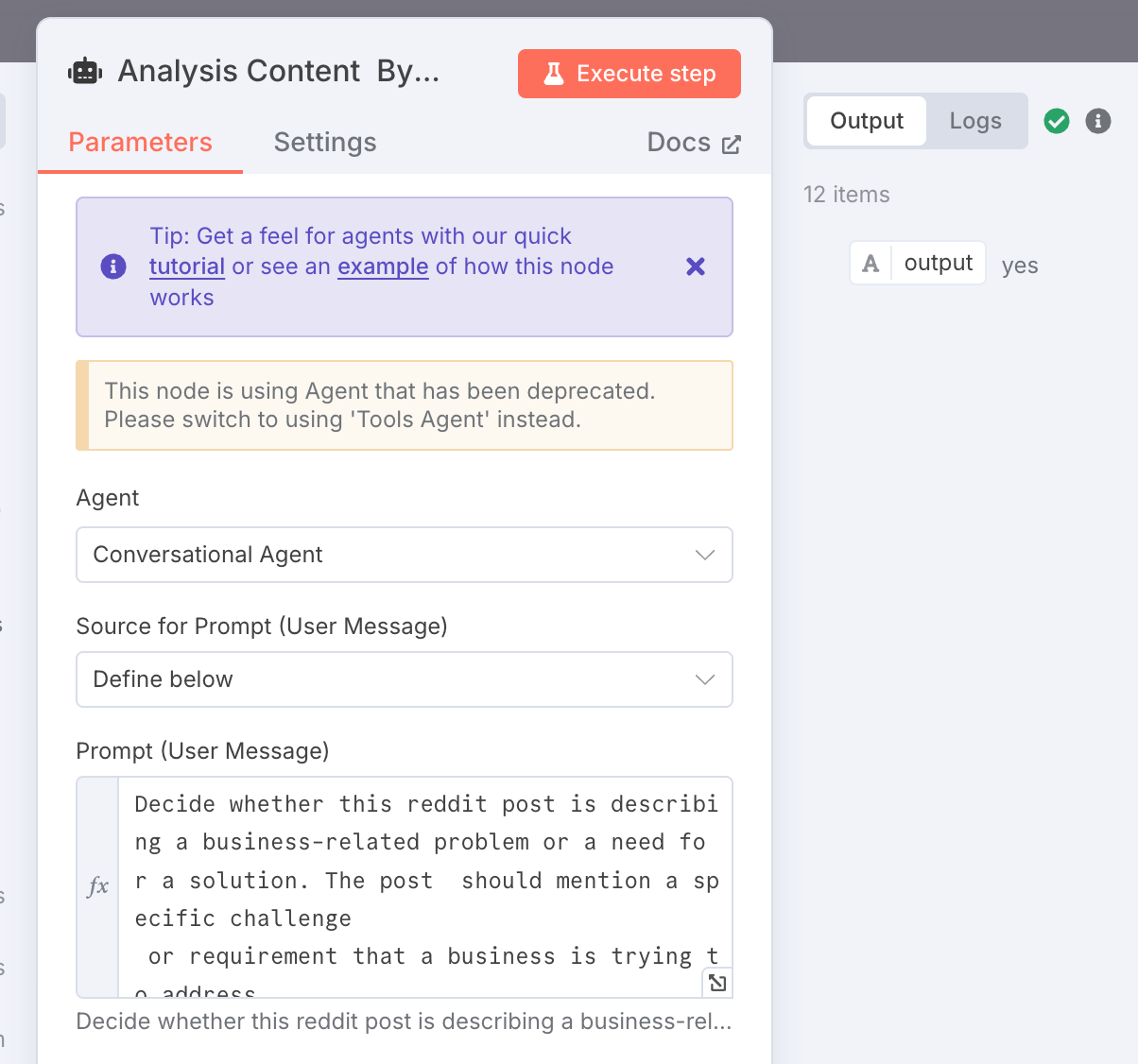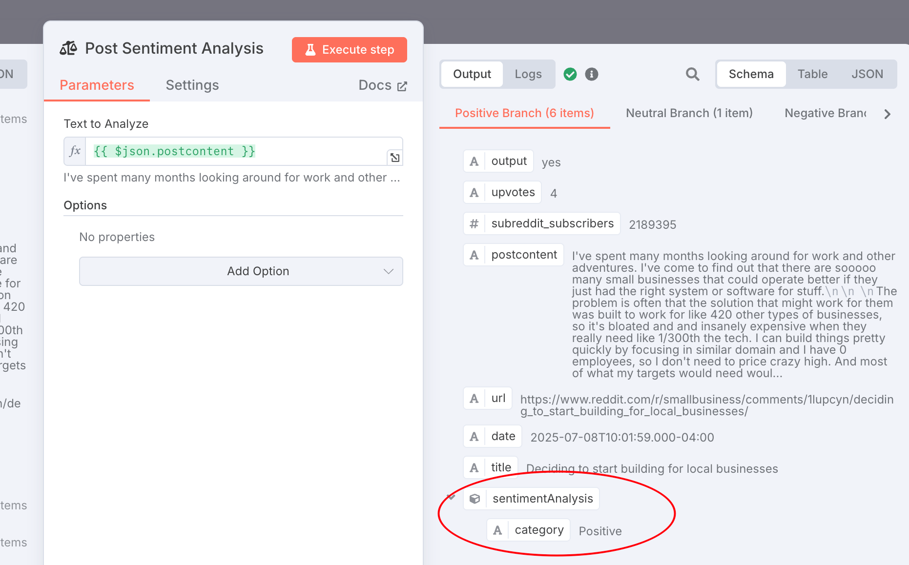 Reddit post: `{{ $json.postcontent }}`