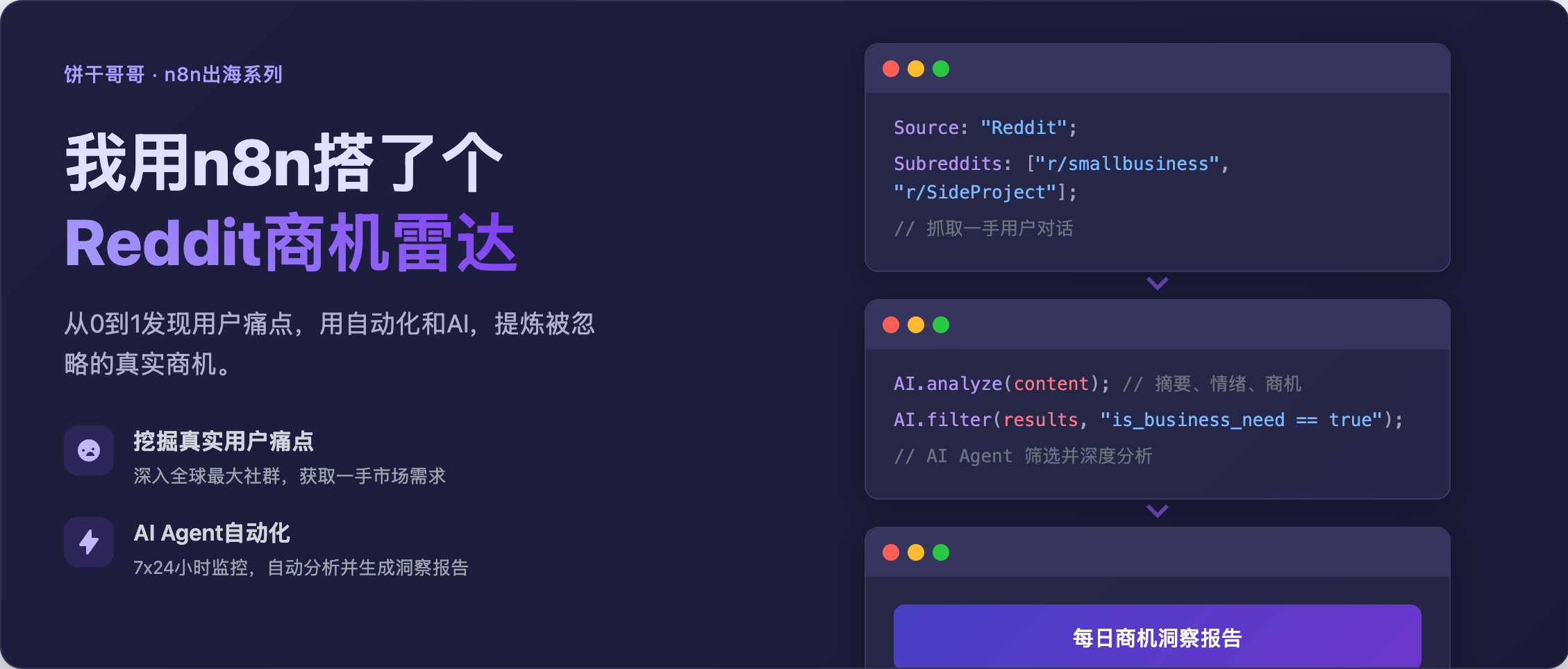 如果你是**创业者或独立开发者**,尤其是刚起步,最大的难题往往不是技术,而是“我到底该做什么?” 你有能力创造,却缺少一个真实、有人愿意付费解决的问题。而如果你是做**出海业务的市场人**,需要找到下一个增长点:用户真正渴望的功能是什么?哪个细分市场的抱怨声最大?这些困境,都源于我们离用户真实、一手的对话太远了。今天,饼干哥哥就手把手带你用n8n,从0到1搭建一个全自动的“Reddit商机发现A