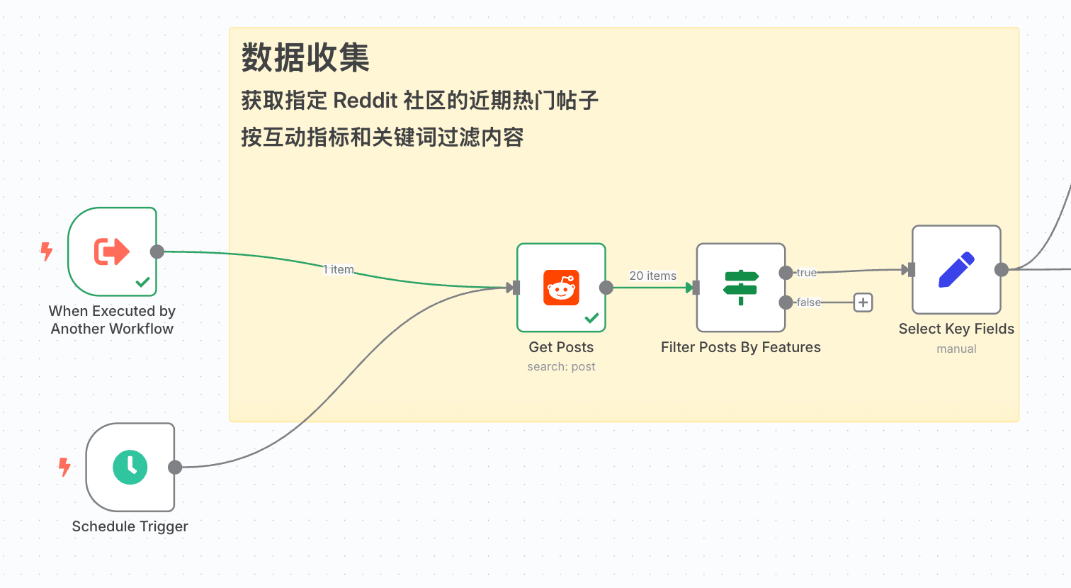 - 作用:这是我们整个工作流的数据源。它负责到指定的Reddit子版块(Subreddit)中,根据关键词获取帖子。