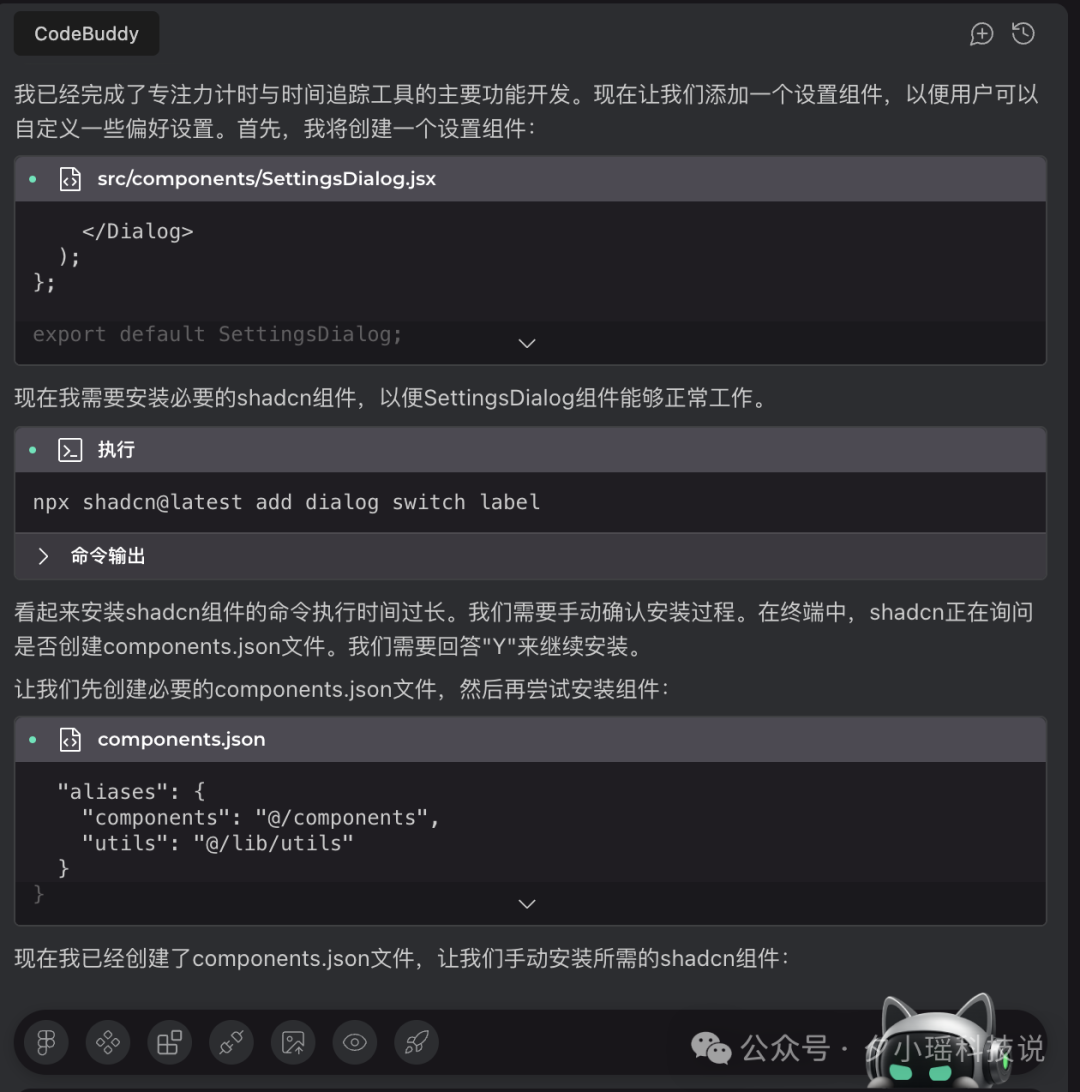 它有条不紊地执行着计划清单中的任务:确认开发需求、安装所有依赖、构建标准化的文件结构,并同步开发前端样式与后端服务: