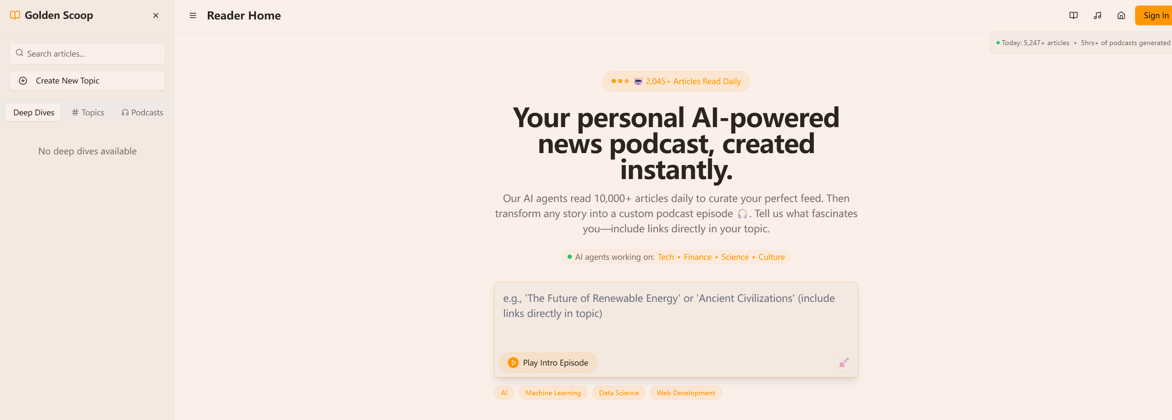 GoldenScoop是一款可以生成播客的应用,能根据用户关心的主题,生成个性化的时间线和播客内容,用于追踪最新信息。