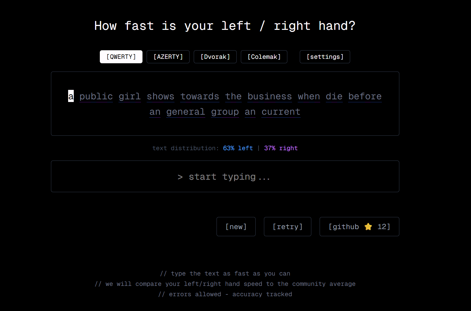 leftright space是一个打字速度测试网站,可以测试用户左右手的打字速度,并与他人进行比较。
