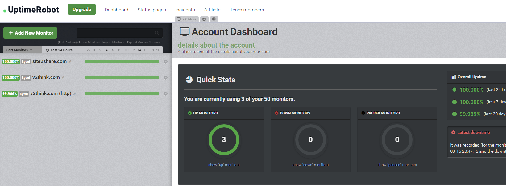 我所购买的是最低配置套餐 Basic B1, 它提供的内存容量是 1.75G。但根据 app service 服务提供的监控统计,我的应用常年使用的内存(memory working set)只需要140MB。想当然硬件基础设施在相当长一段时间内都足以保证功能的正常运行。所以我不需要 Monitoring 里的对于基础设施的报警 alert (运行 alert 也需要额外花费),也不需要在菜单栏上常驻一个升级硬件用的 Scale up 按钮。而关于应用级别的监控,我可以利用第三方的免费服务 UptimeRobot: