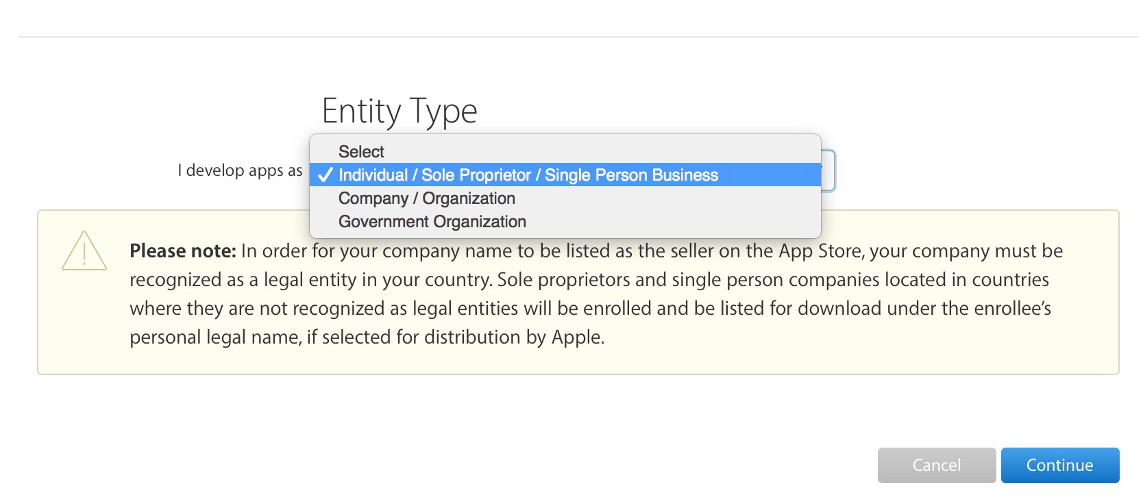 4、选择想要申请的账号类型,此处做如下选择(选择为个人开发者账号),点击“Continue”