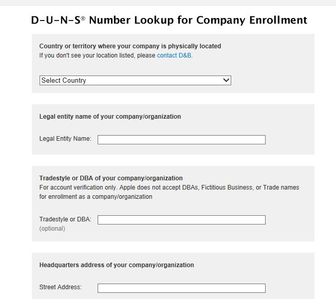 1)首先需要一个邓白氏码,进入 https://developer.apple.com/ios/enroll/dunsLookupForm.action 填写信息: